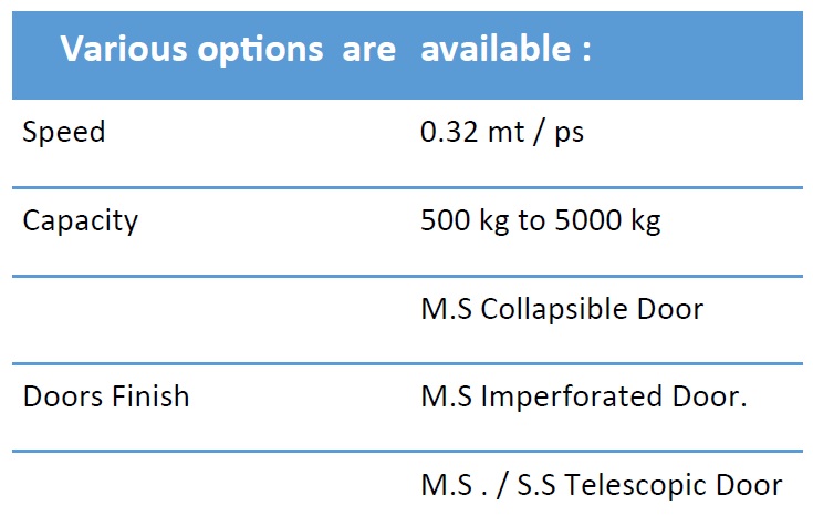 Goods Elevators for Commercial & Industrial Buildings depending upon the shaft size with speed / amenities up to choice of owners.